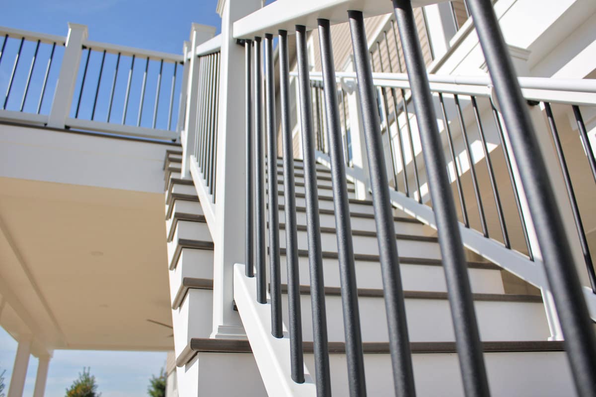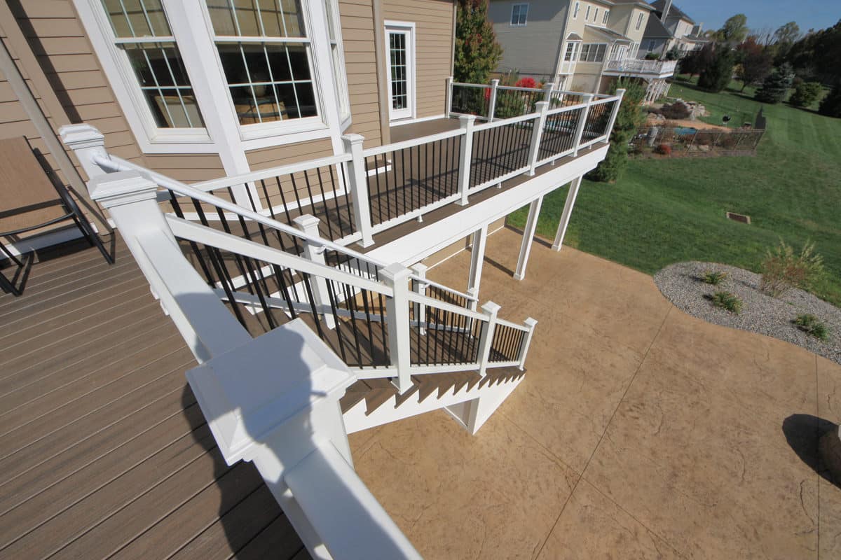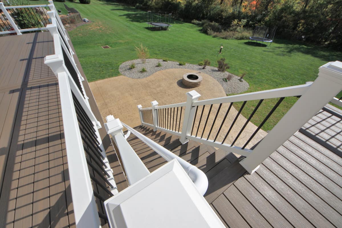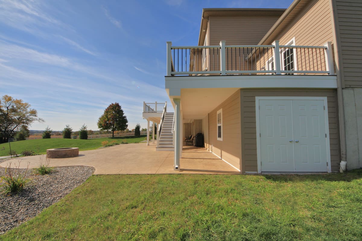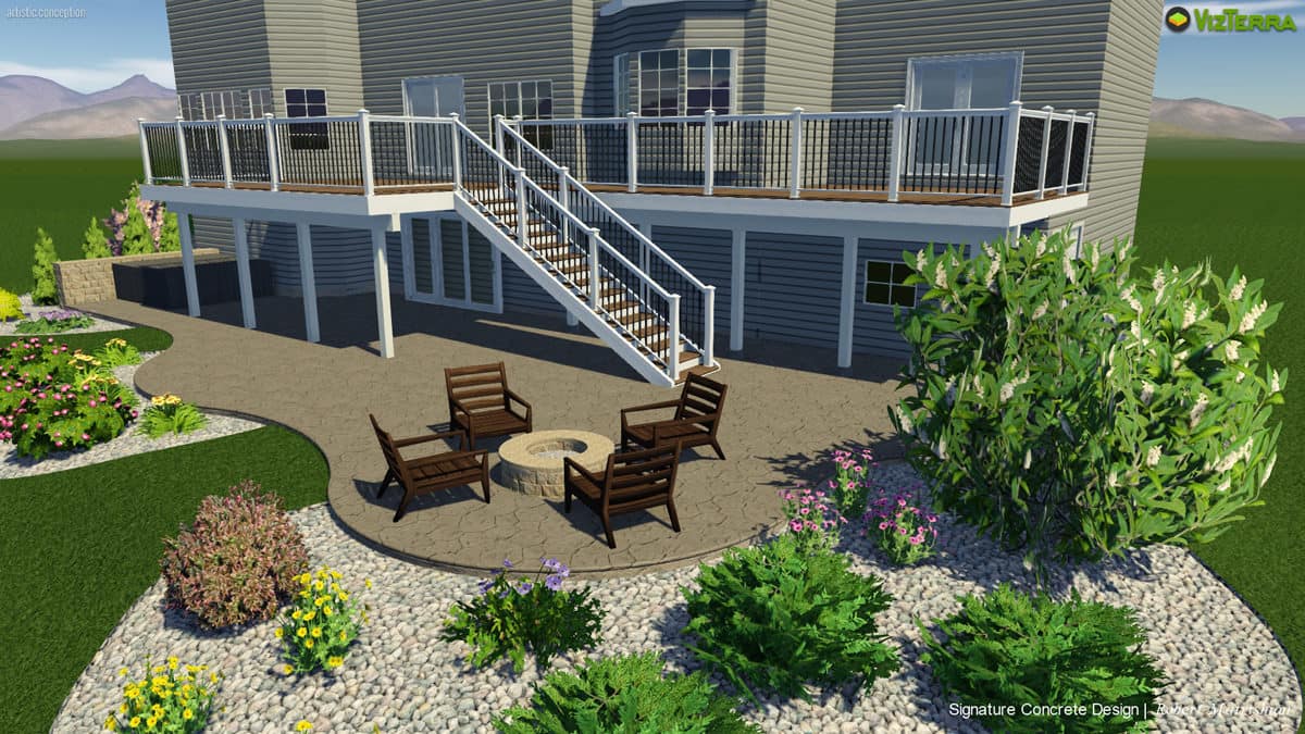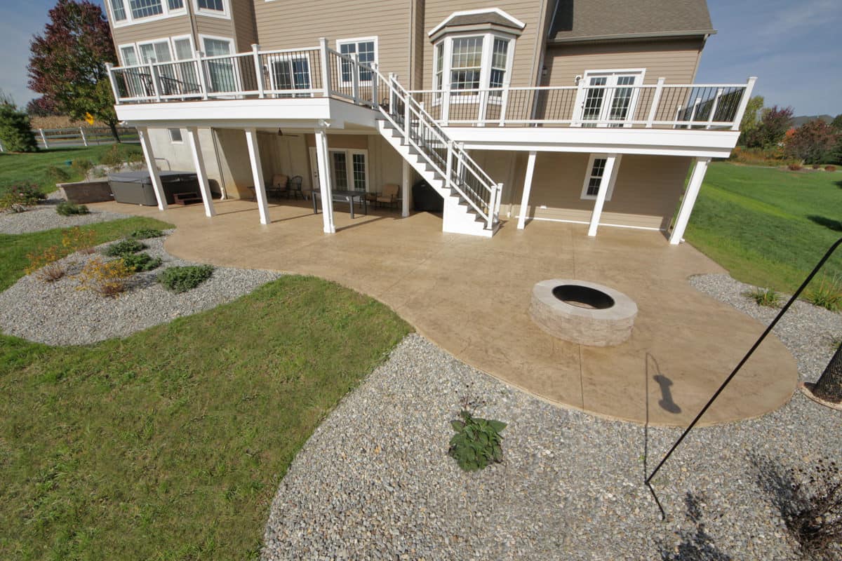 We designed a deck and patio layout that achieved the vision they were thinking of. We began this design by shaping the deck to expand from one door to the other. Doing this created two spaces with a narrow area in between to go from one side of the deck to the other. The deck was also designed to go as far out from the house as possible with limited posts. This would create a massive gathering spot underneath the deck, with limited posts to interrupt the area. The deck leads to the large patio by a set of trex steps. The stamped concrete patio has four spaces and an area for a large shed under the deck. The large, main area of the patio is located under the main portion of the deck. It will remain dry because we added a Trex Rain Escape system. This area will likely be the most used hangout spot for family and friends for the years ahead. There is also the firepit area, the hot tub area, and an extra space that we shaped into the curves of the patio that will give extra room for smaller furniture or other uses.